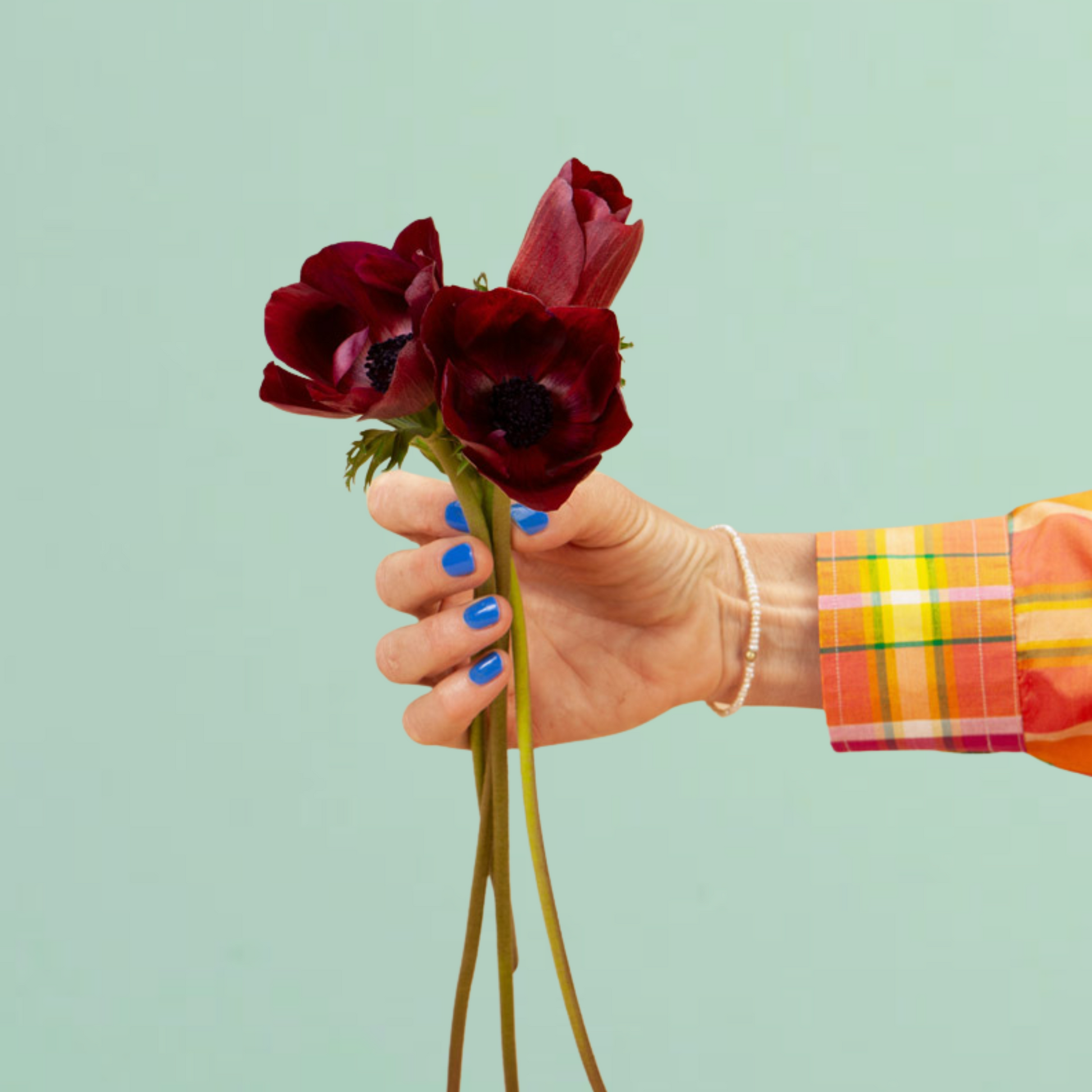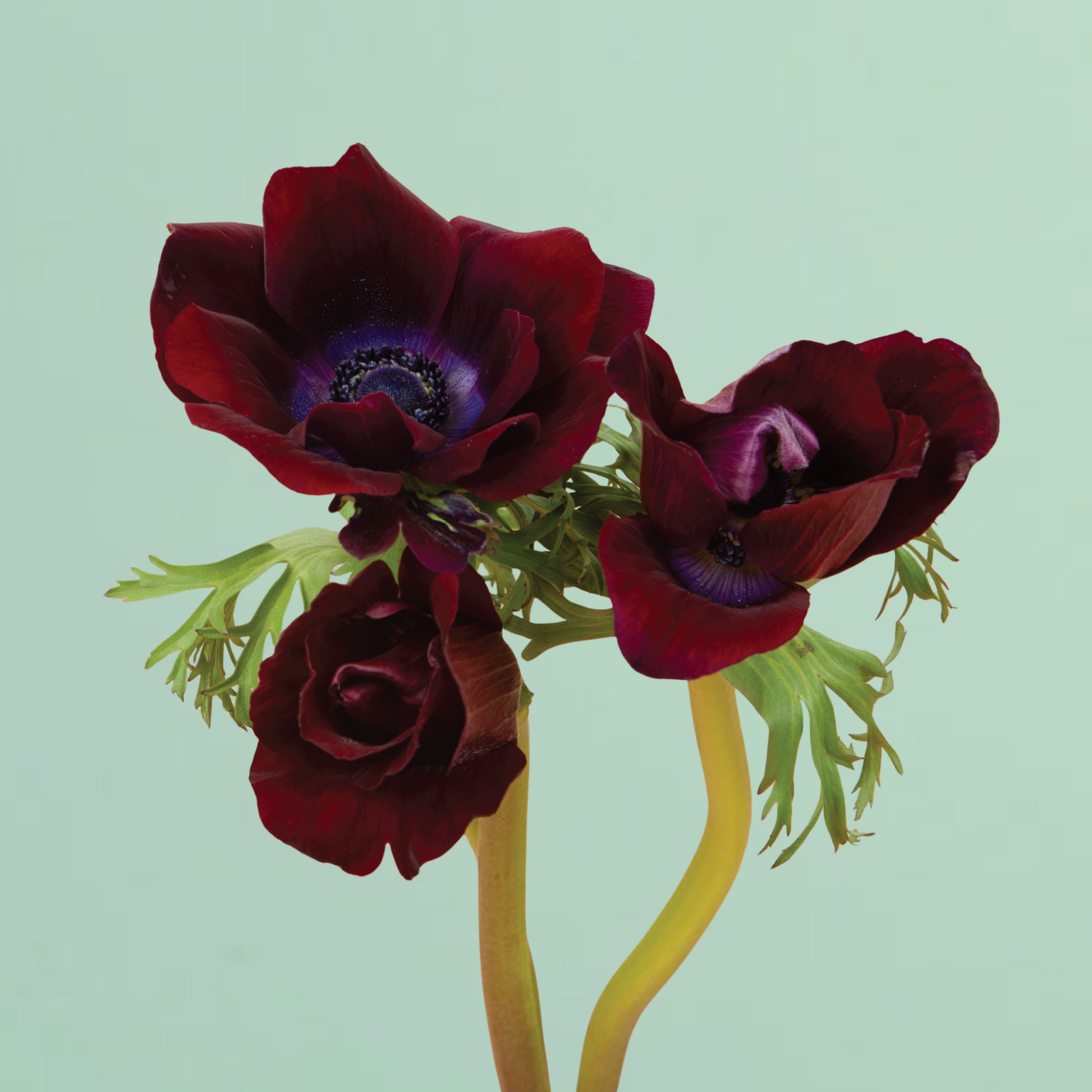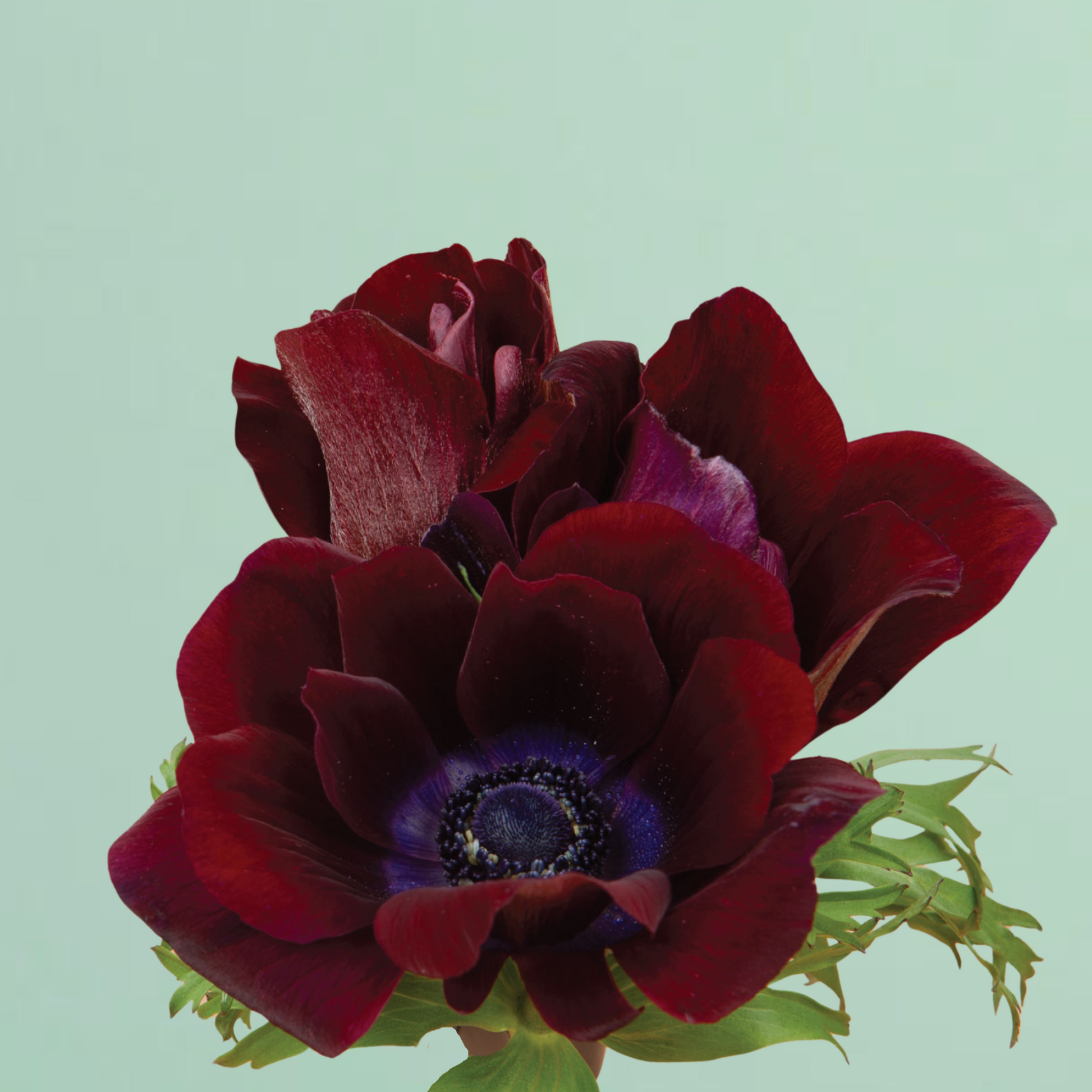 Carmel Bordeaux Anemone have a luscious velvety burgundy color, offset with a purple flush in the middle, and then a black center.