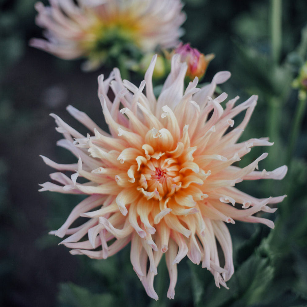 Henriette is a handsome little weirdo. So much to love in that melon-pink, cactus- shaped bloom, with the buttery center. Henrietta is an excellent cut flower- really strong stems, long vase life, prolific bloomer, and can handle the elements better than most. Plus - she's so cute! Just look at her! We love you, Henriette.