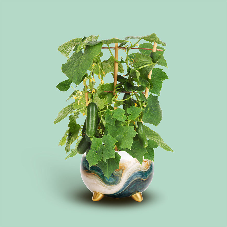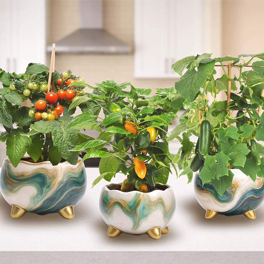 This curated set of Kitchen Minis includes a Siam tomato plant, a Fresh Bites Yellow pepper plant, and a Quick Snack cucumber plant, all bred for compact growth and big flavor. These are the plants that thrive in small spaces and reward you quickly, whether you’re growing on a sunny windowsill, patio, or kitchen counter that gets good light and good vibes.